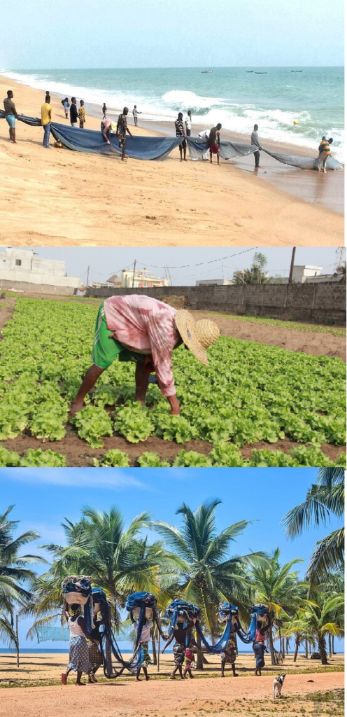 Agoué : En raison de sa position côtière, la pêche maritime est l’activité dominante. Les pêcheurs capturent diverses espèces de poissons, et les femmes s’occupent de la transformation et de la commercialisation des produits halieutiques. En plus de la pêche, le maraîchage est aussi développé