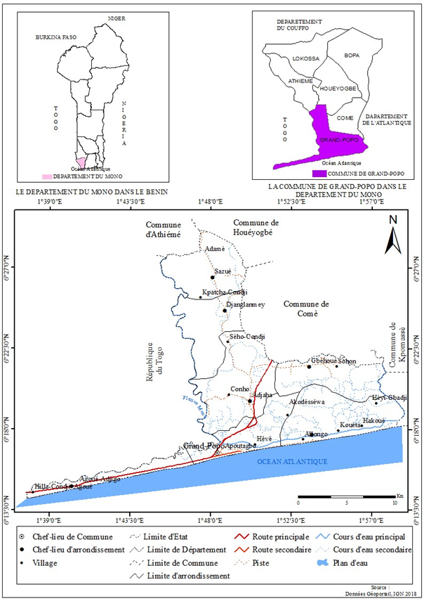 Située entre 1°30’ et 2°00’ de longitude Est et 6°10’ et 6°30’ de latitude Nord, et coincée entre la mer (océan Atlantique) et le lagon du fleuve Mono. Elle est une commune et une ville côtière du sud-ouest du Bénin, au sein du département du Mono, dans la baie du Bénin. Traversée la route RNIE 1, la commune de Grand-Popo bénéficie naturellement d’une position stratégique : sa proximité de la frontière togolaise et sa position sur le corridor Lagos/Abidjan en desservant Lagos, Cotonou, Lomé, Acra et Abidjan et l’hinterland.
